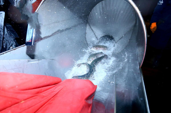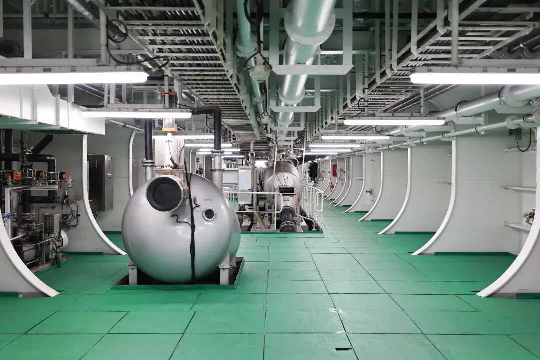 “蘇海1號(hào)”的投產(chǎn)運(yùn)營(yíng),標(biāo)志著連云港市深遠(yuǎn)海養(yǎng)殖邁入了新階段。養(yǎng)殖工船總長(zhǎng)249.8米、型寬45米、型深21.6米,排水量13.2萬(wàn)噸,配備15個(gè)封閉式養(yǎng)殖艙,有效養(yǎng)殖水體達(dá)8.3萬(wàn)立方米。養(yǎng)殖工船通過(guò)全船智控系統(tǒng)實(shí)現(xiàn)水體、供氧、飼喂的精準(zhǔn)調(diào)控,24小時(shí)內(nèi)可完成16次水體交換,為三文魚創(chuàng)造低應(yīng)激、高標(biāo)準(zhǔn)的生長(zhǎng)環(huán)境,其獨(dú)特的游弋式生產(chǎn)能力,可主動(dòng)追尋黃海冷水團(tuán)等適宜水域,有效規(guī)避臺(tái)風(fēng)、赤潮等自然災(zāi)害風(fēng)險(xiǎn)。在產(chǎn)業(yè)鏈延伸方面,工船構(gòu)建了“船載加工、岸海聯(lián)動(dòng)”的一站式工程體系,從起捕到冰鮮、速凍加工全程可控,結(jié)合高效冷鏈物流,最快24小時(shí)即可從養(yǎng)殖源頭直達(dá)餐桌。